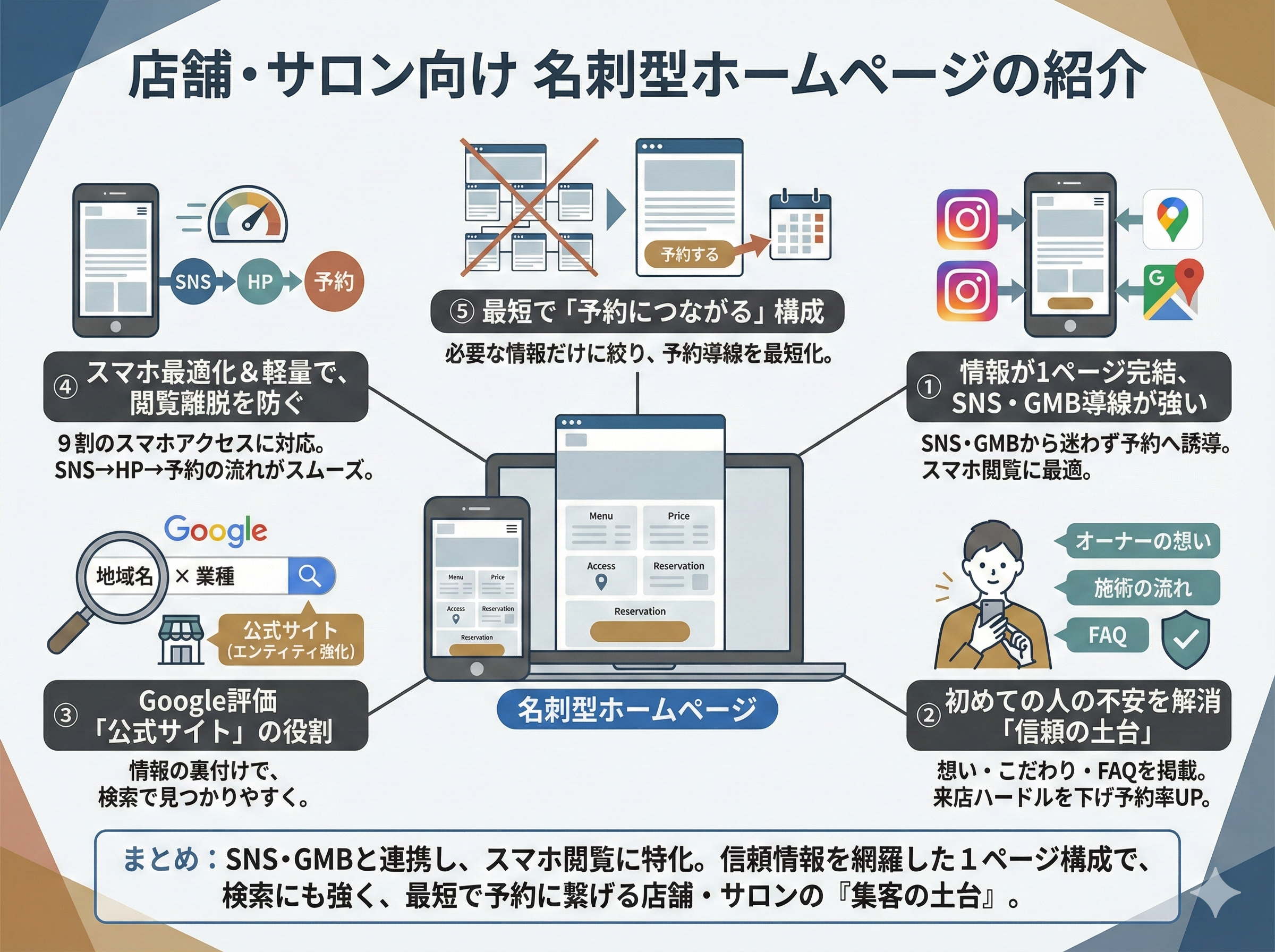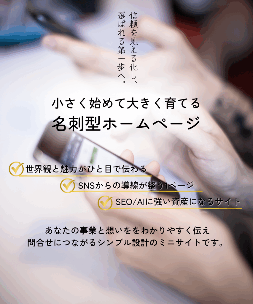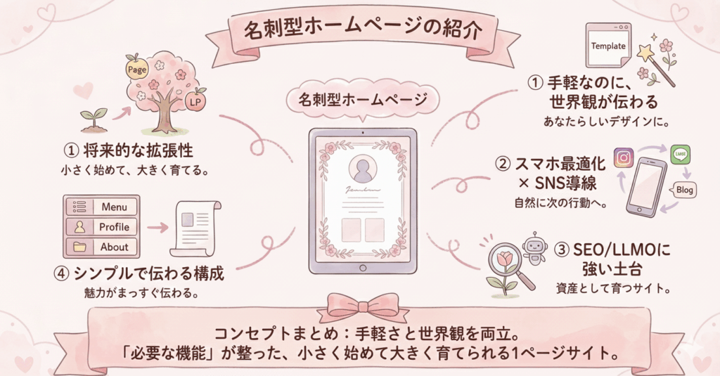 1ページの名刺型としてスタートしつつ、あとからご自身でのページ追加(About/メニュー)やLPの増設も可能。独自ドメインで運用するため、この名刺型ホームページがあなたの事業の土台としてずっと使えます。
